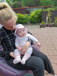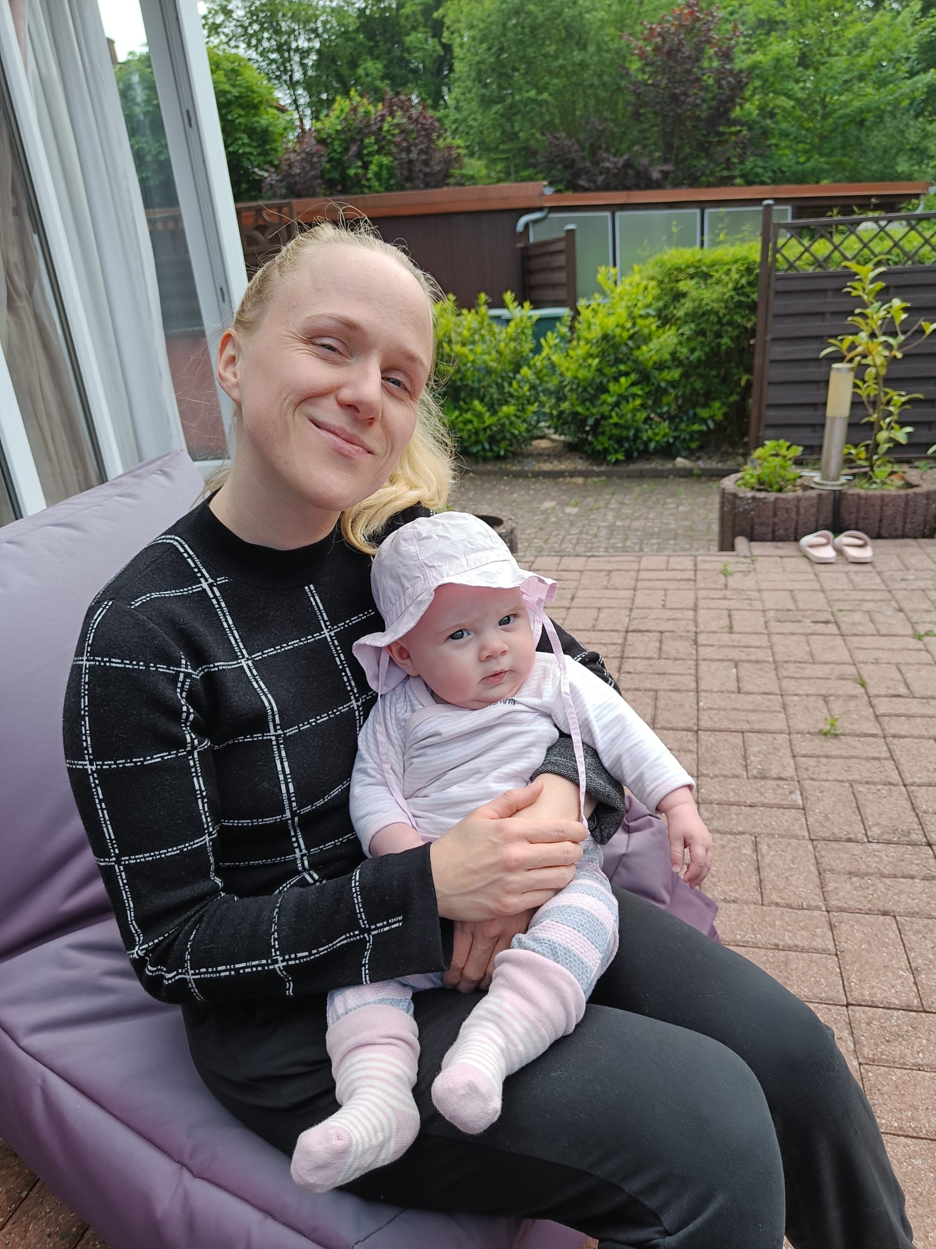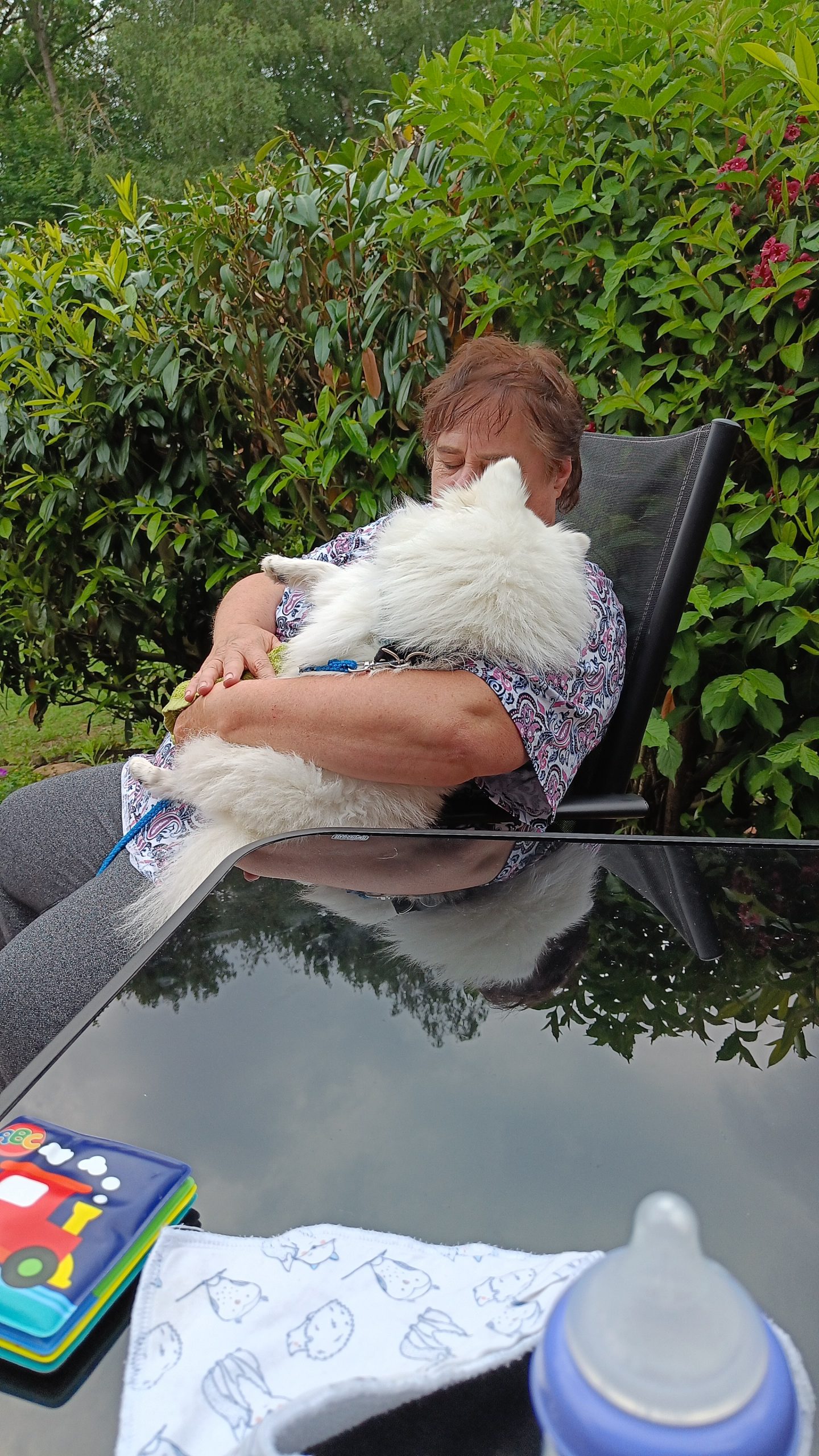01.06.2022 Aryana - Von Anfang an Opa, Oma und Ulrike waren wieder da. Opa hat meinen Hochstuhl aufgebaut. Ulrike hat mit Loki gespielt. Die bleibt jetzt 2 Tage bei uns.