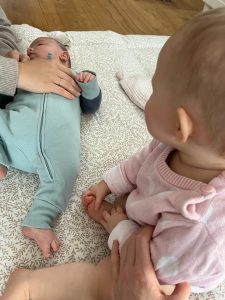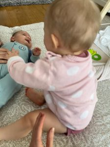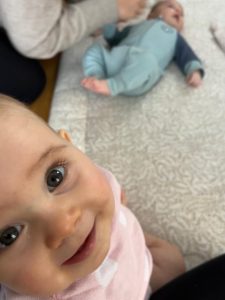 Morgens bin ich immer gleich wach und lache. Mein Brötchen war wieder lecker. Dann waren wir noch bei einer Arbeitskollegin von Mama. Die hat ein Baby, das ist noch kleiner als ich. Wenn Marlon größer wird können wir auch zusammen spielen.