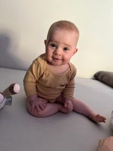 08.08.2022 Aryana - Von Anfang an Seht ihr, wie ich in meinem Hochstuhl sitzen kann. Bald kann ich ganz alleine essen! Einkaufen waren wir auch wieder. Und ich habe natürlich wieder mit meinen Bauklötzen gespielt.