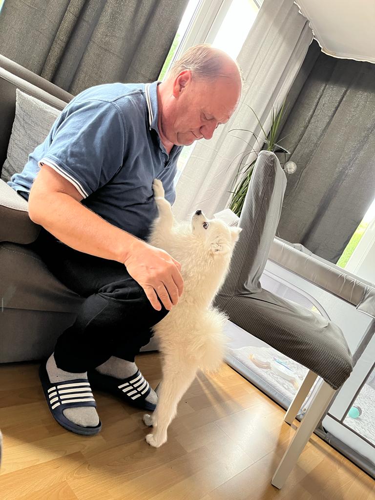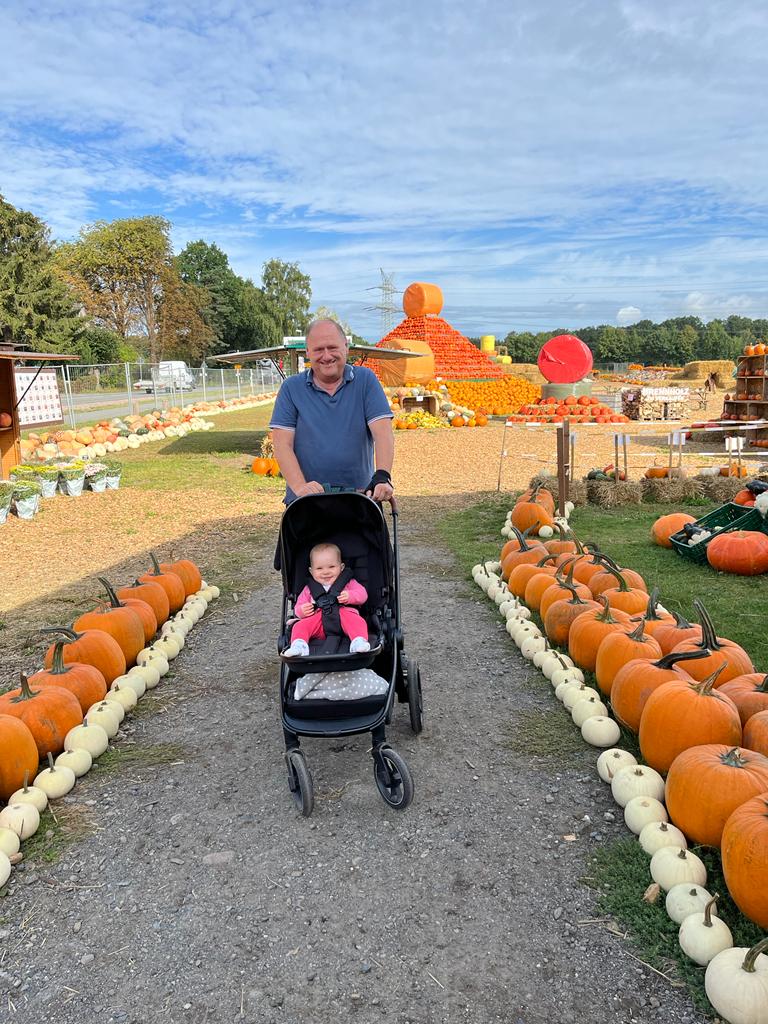 Opa war ja noch da und hat mit mir gespielt. Aber auch Loki war dauernd bei ihm. Wir waren auf einem Kürbishof frühstücken. Da hatte ich wieder meinen eigenen Stuhl.