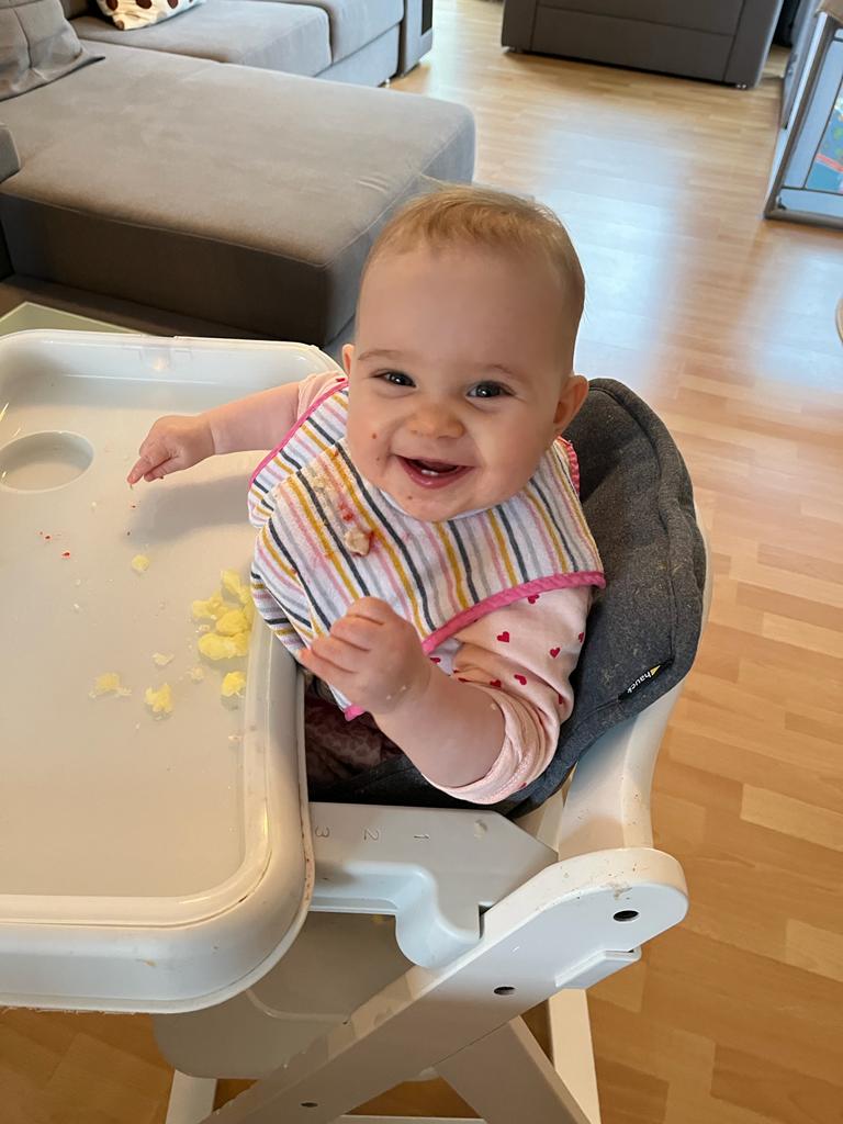 14.11.2022 Aryana - Von Anfang an Heute gab es ein bisschen weich gedünsteten Apfel. Das fand ich super lecker. Sieht man doch, das ich zufrieden bin – oder?
