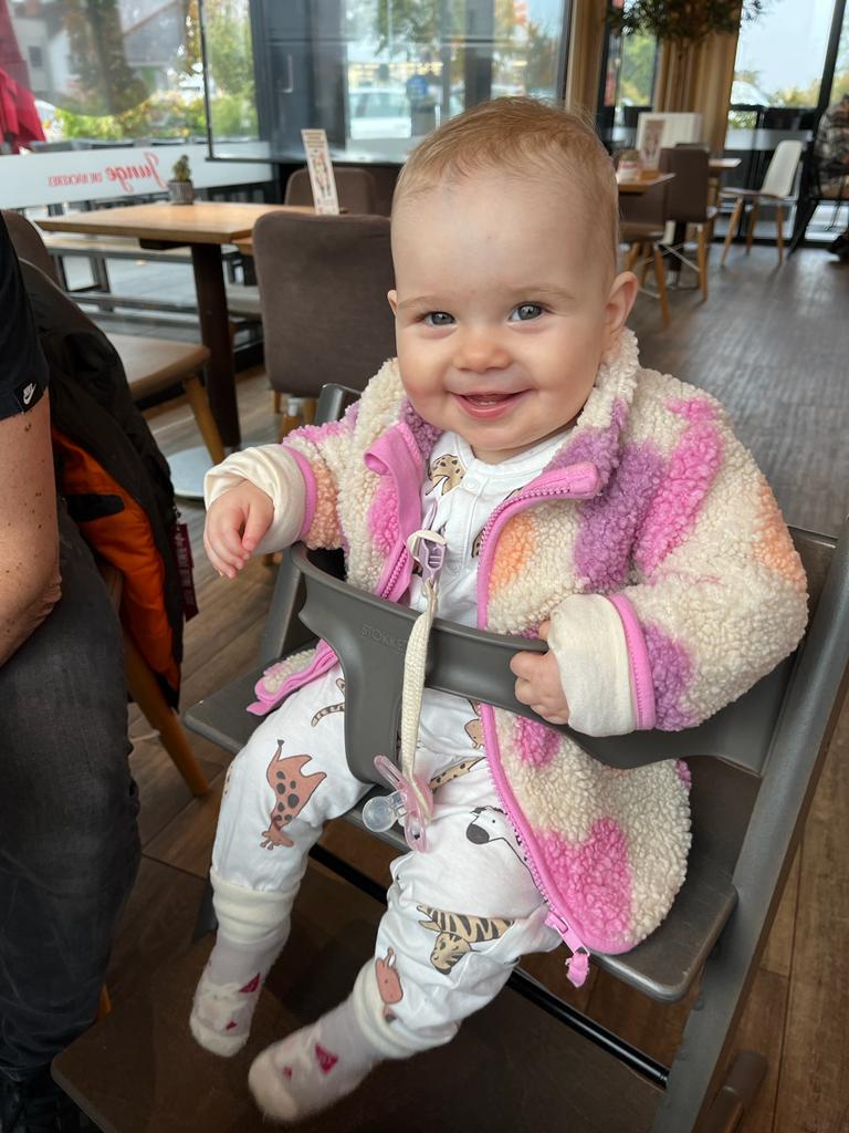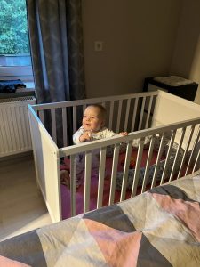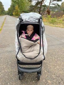 Mama hat einen Schutz für meinen Kinderwagen, damit ich nicht nass werde, wenn wir im Regen unterwegs sind. Regenmobil nennt sie das.