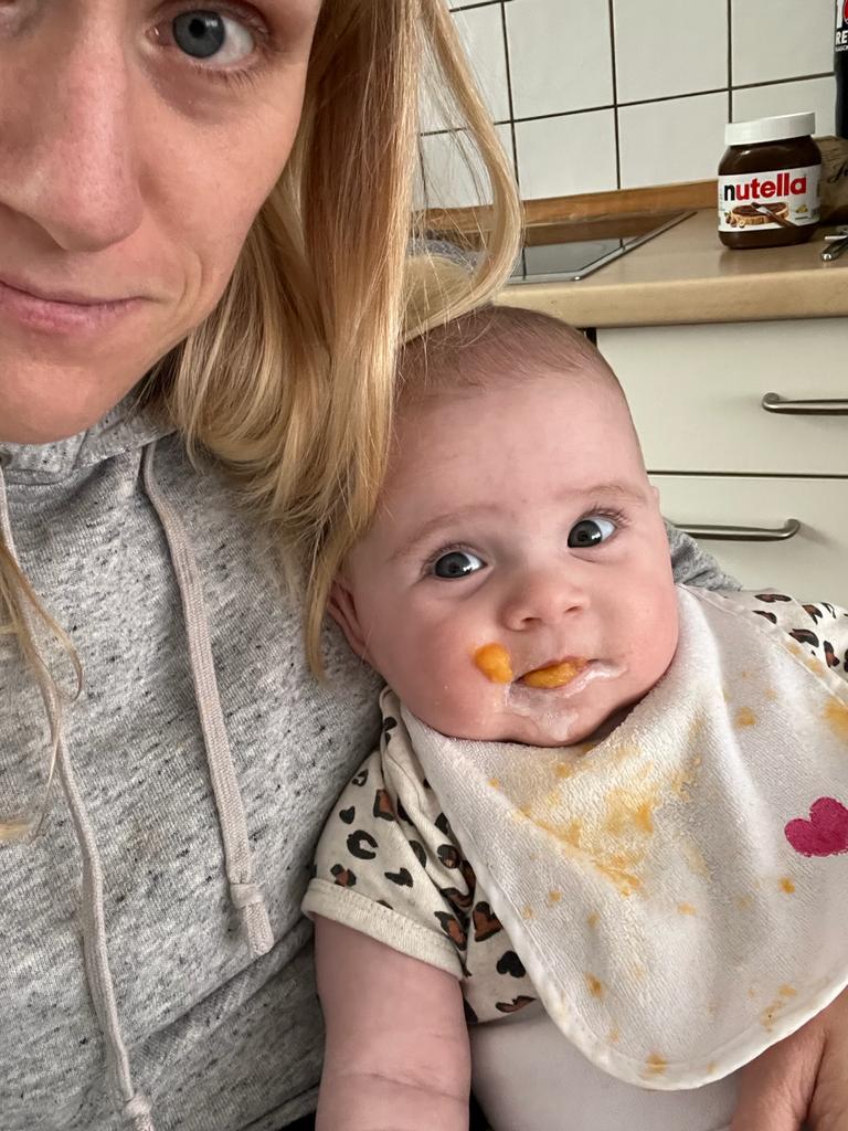 29.05.2022 Aryana - Von Anfang an Ich habe wieder Brei bekommen. Danach sah es so aus, als ob ich alles nur auf dem Lätzchen hätte. Dabei habe ich toll gegessen.
