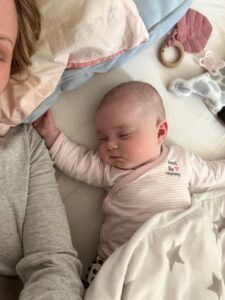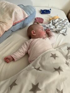 Heute habe ich mich mal andersrum gedreht. Immer auf dem Rücken liegen war mir zu langweilig. Da habe ich es mal auf den Bauch versucht. Nu muss ich nur noch krabbeln üben.