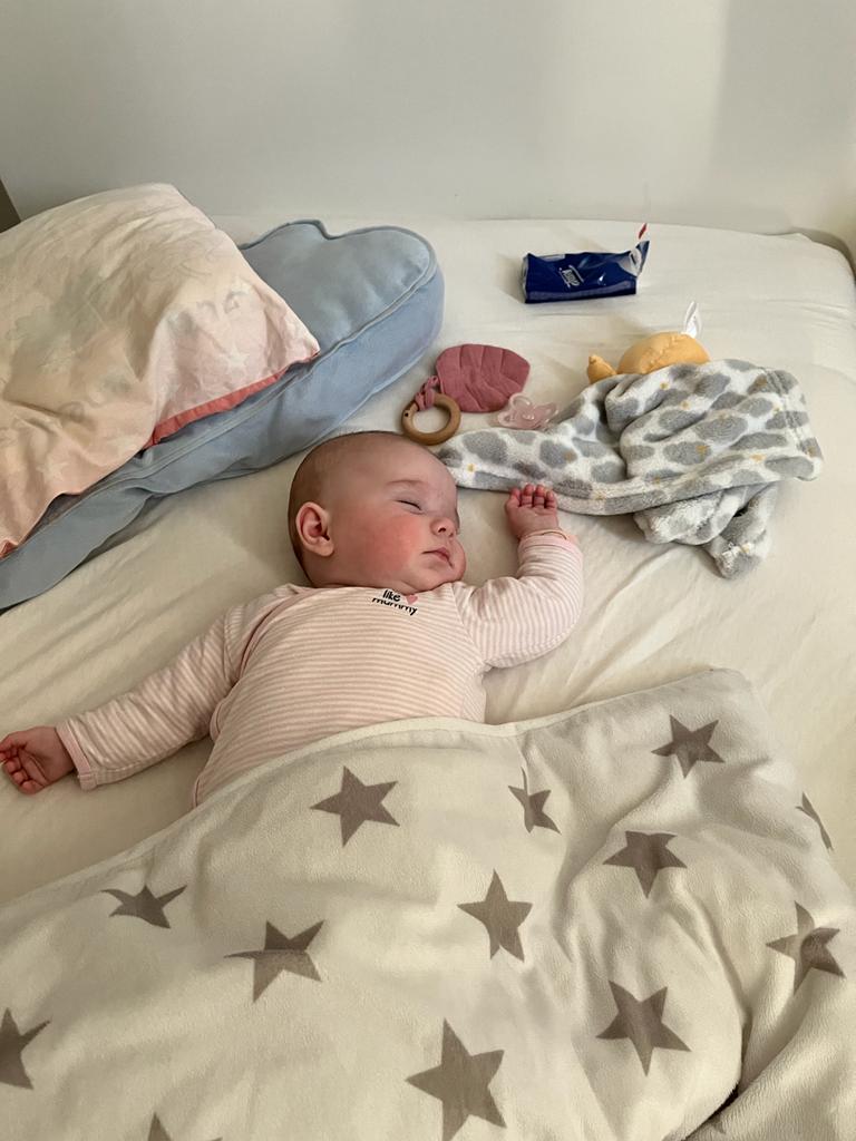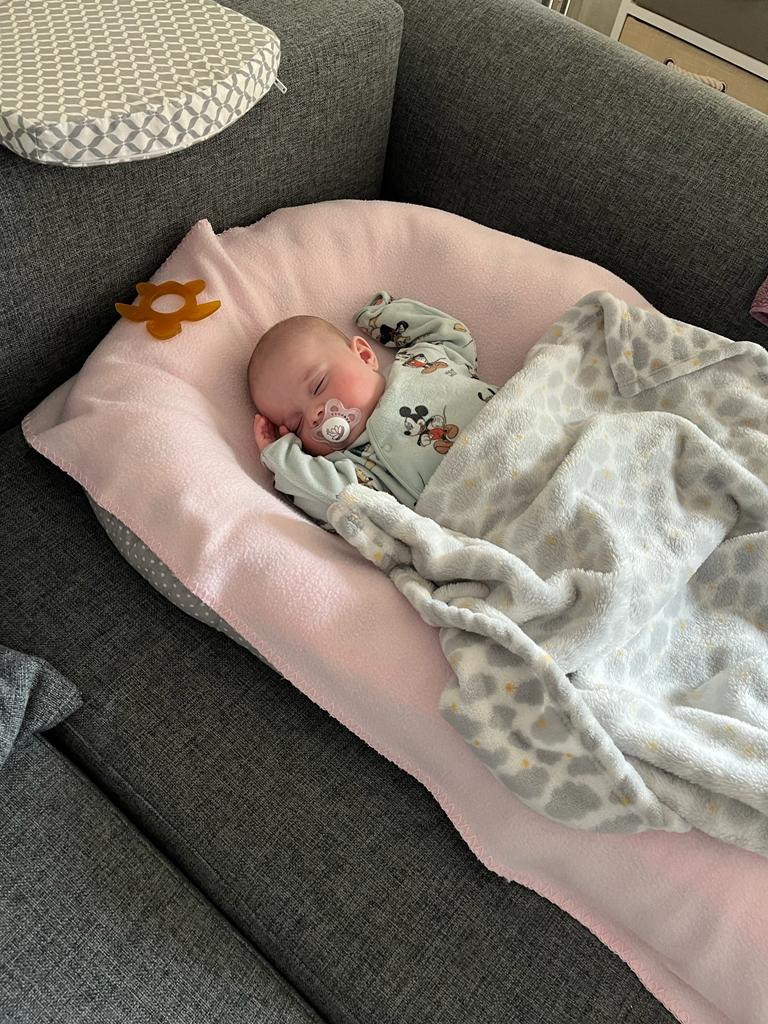 Heute habe ich mich mal andersrum gedreht. Immer auf dem Rücken liegen war mir zu langweilig. Da habe ich es mal auf den Bauch versucht. Nu muss ich nur noch krabbeln üben.