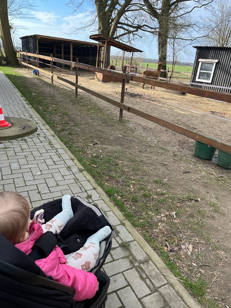 Wir sind in der Woche auch noch oft spazieren gewesen. Da kann ich auch mal aus meinem Kinderwagen raus und selbst ein wenig laufen. Am meisten macht es Spaß, wenn ich dabei mit Loki spielen kann.
