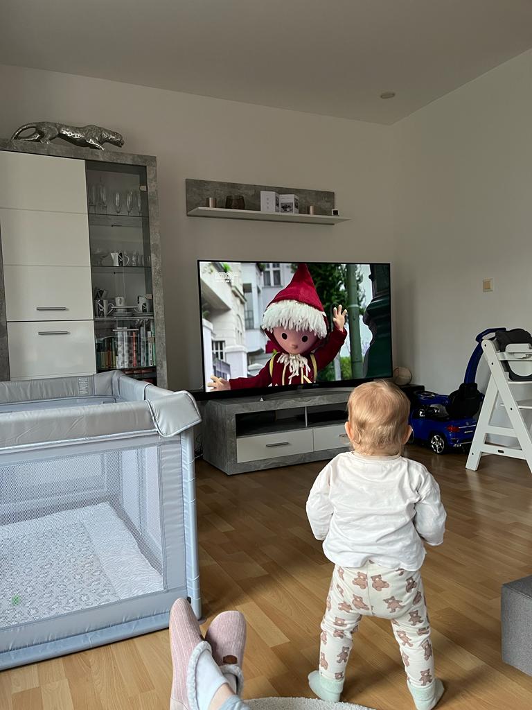 Neuerdings weiß ich wo die Fernbedienung für den Fernseher ist. Wenn ich die Mama bringe darf ich manchmal auch für ein paar Minuten das Sandmännchen oder Kindergartenlieder anhören. Dann klatsche und tanze ich mit den Leuten im Fernsehen. Oft sagt Mama aber auch NEIN. Finde ich dann doof.