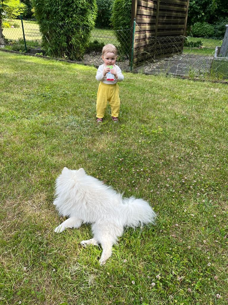 Dafür spiele ich jetzt oft mit Loki. Das macht besonders viel Spaß. Und ich habe ein Häuschen und viele andere Gartenspielzeuge bekommen. Da kann ich mich im Garten toll austoben.