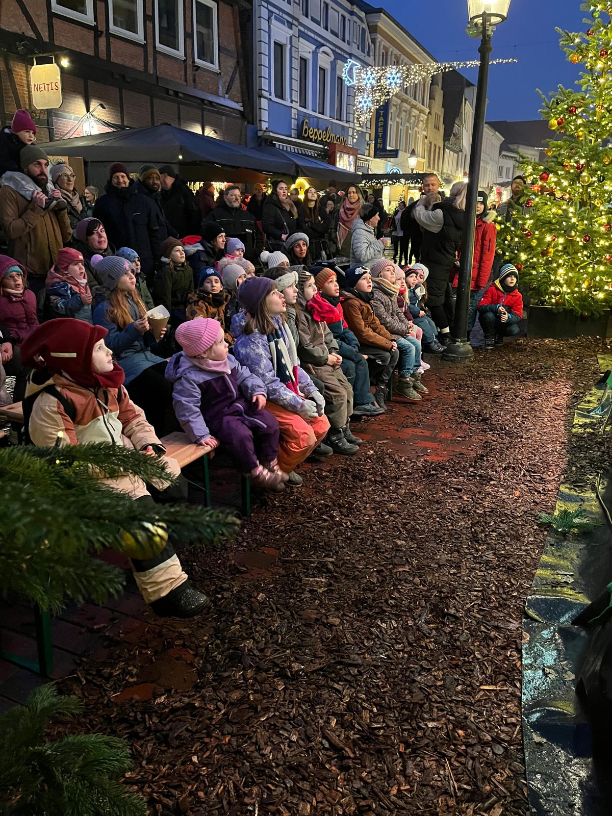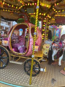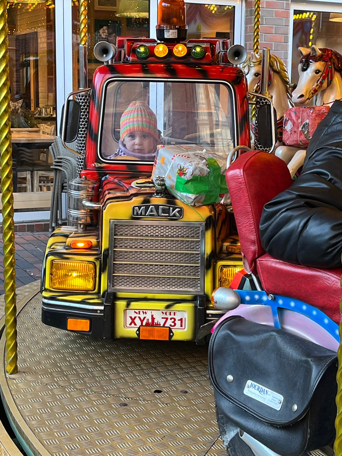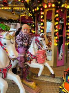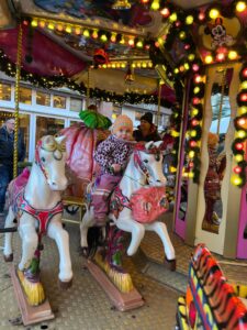 Wir waren auf dem Weihnachtsmarkt mit Karussels und einem Sänger – weil ich mir das gewünscht habe.